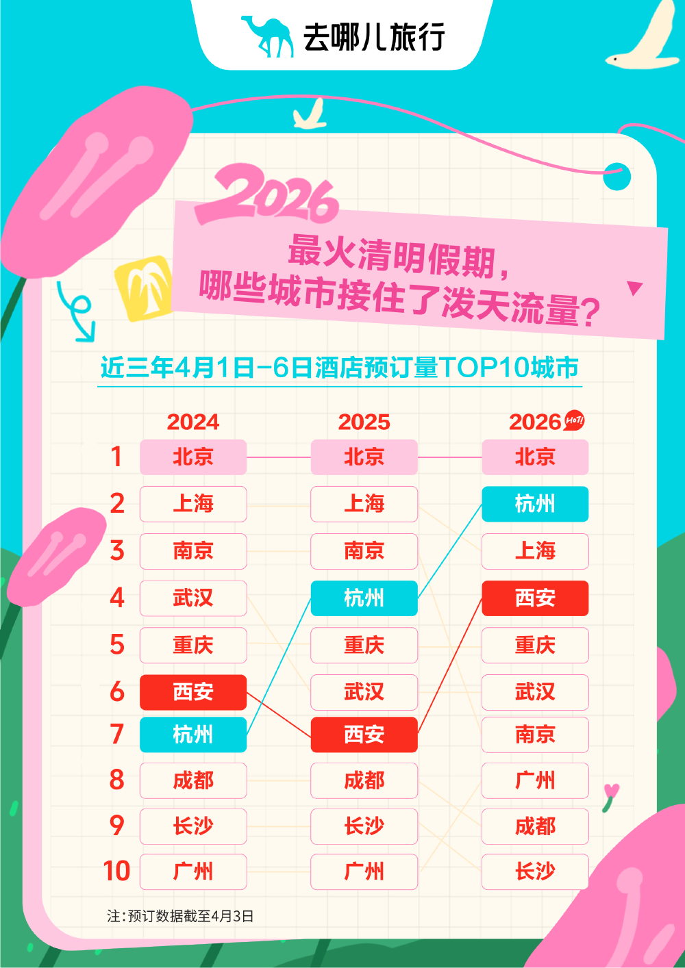 撞上春假的清明带动4月“淡季不淡”,哪些城市接住了春假加清明的“泼天流量”?截至4月3日,清明假期酒店预订量最高的前10名城市为:北京、杭州、上海、西安、重庆、武汉、南京、广州、成都、长沙。重庆位列全国第六,显示出强劲的旅游吸引力。